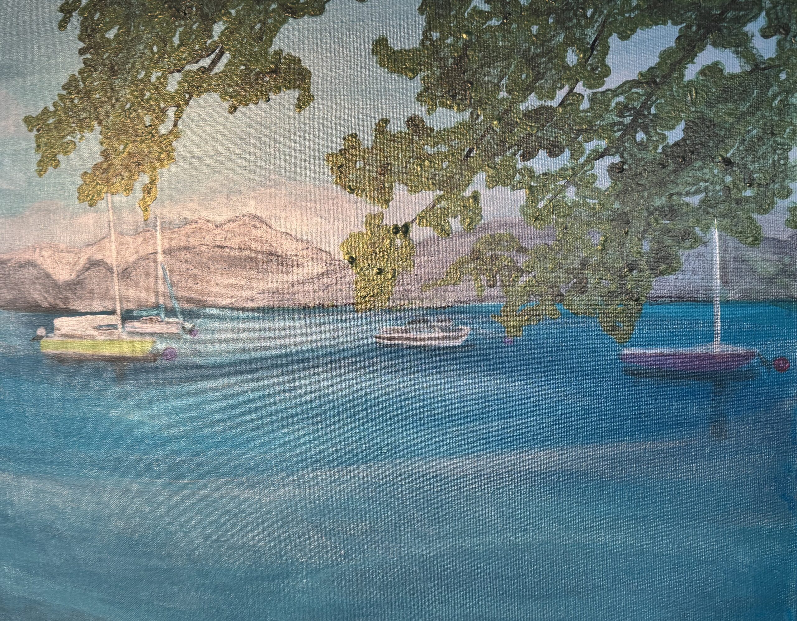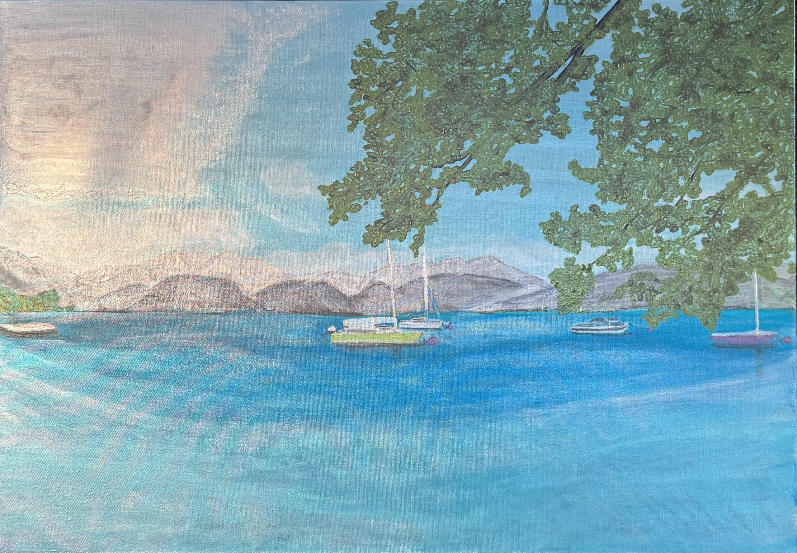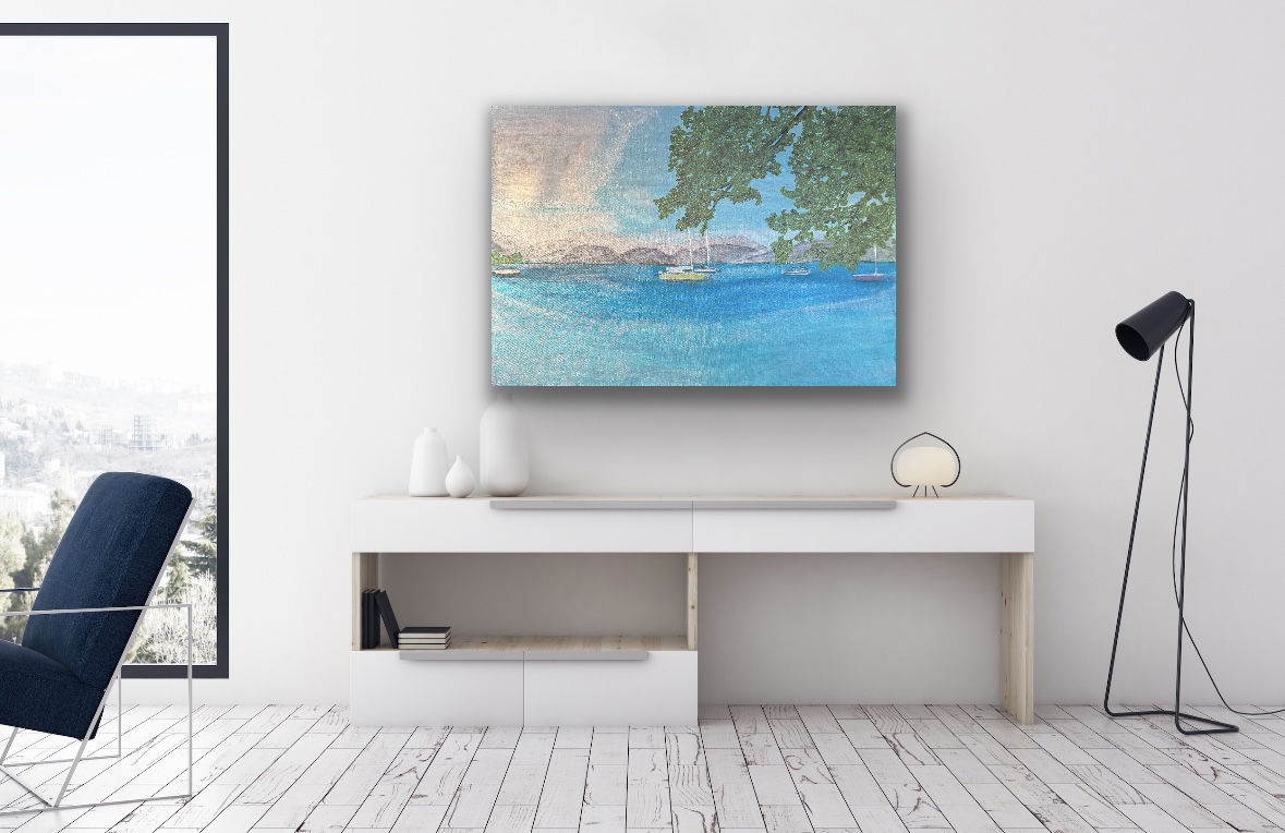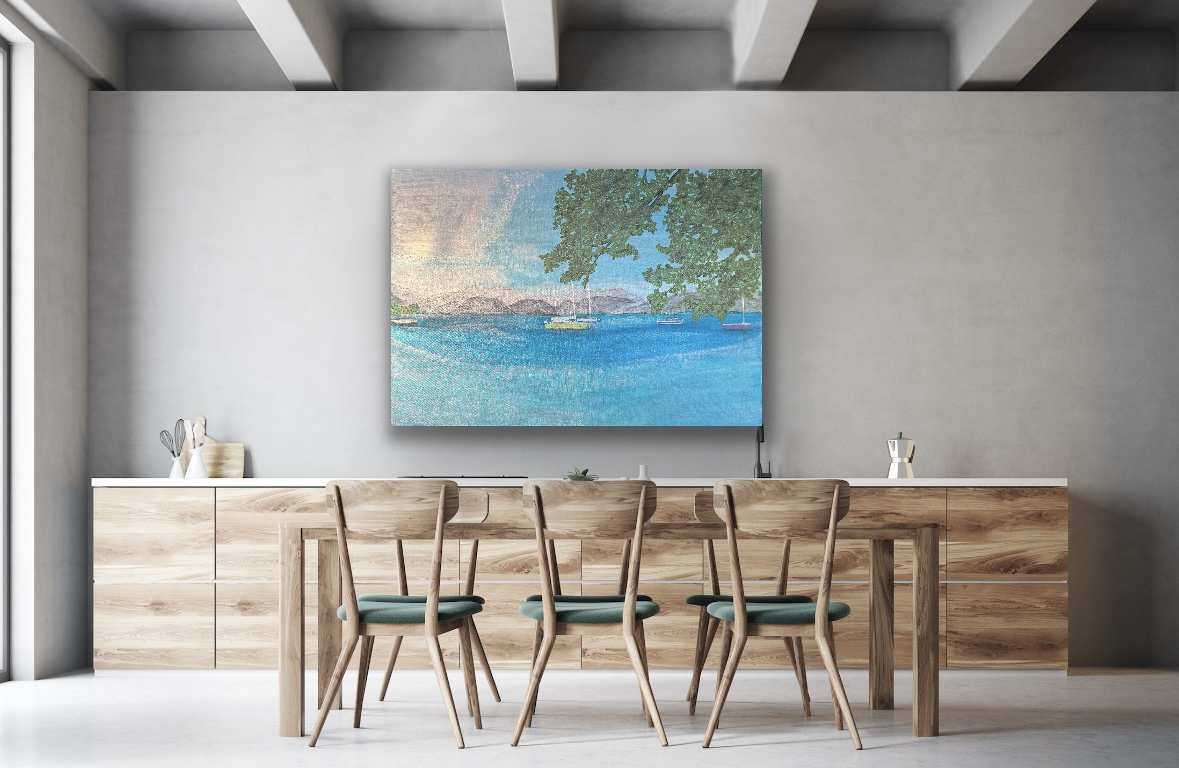 Dieses Werk eröffnet einen weiten, atmosphärischen Blick über eine glasklare Bucht, in der Segelboote sanft auf dem Wasser ruhen. Die Künstlerin erzeugt ein harmonisches Zusammenspiel aus Licht, Farbe und Tiefe.