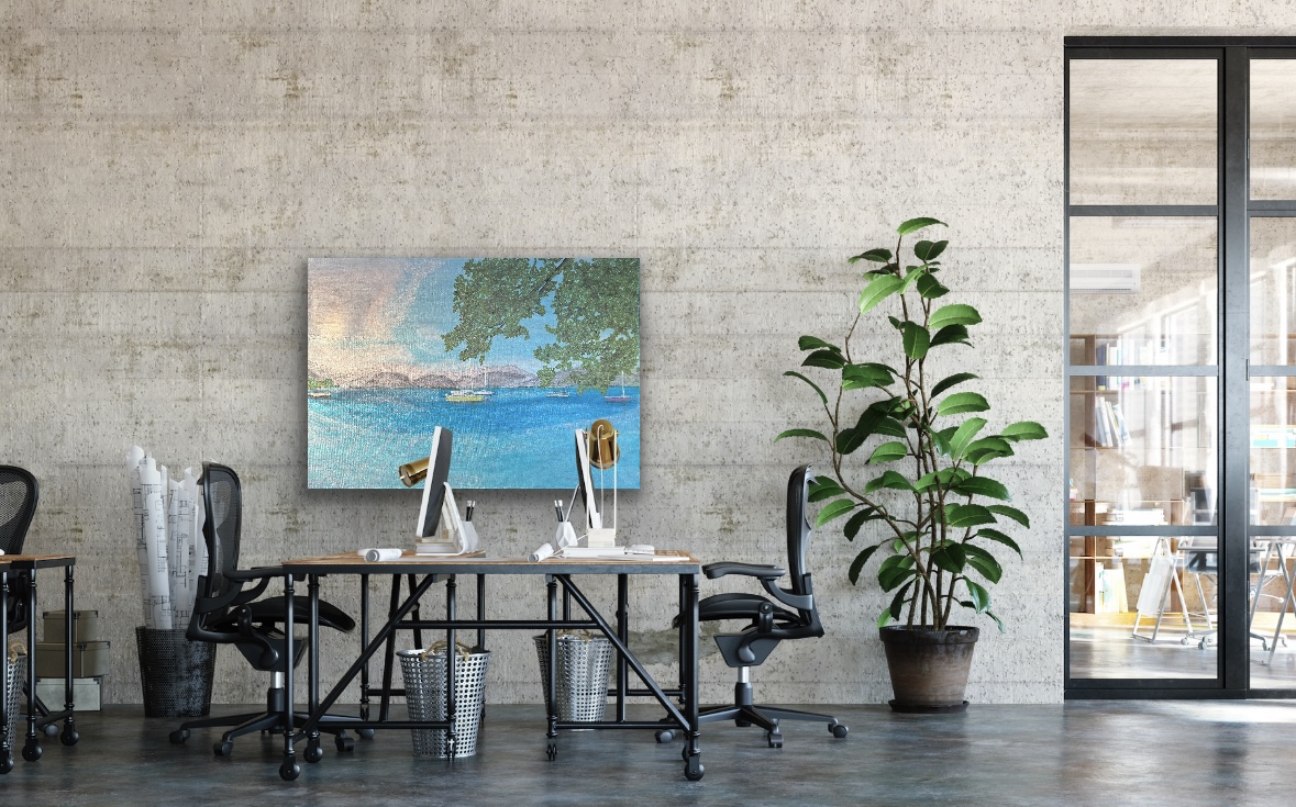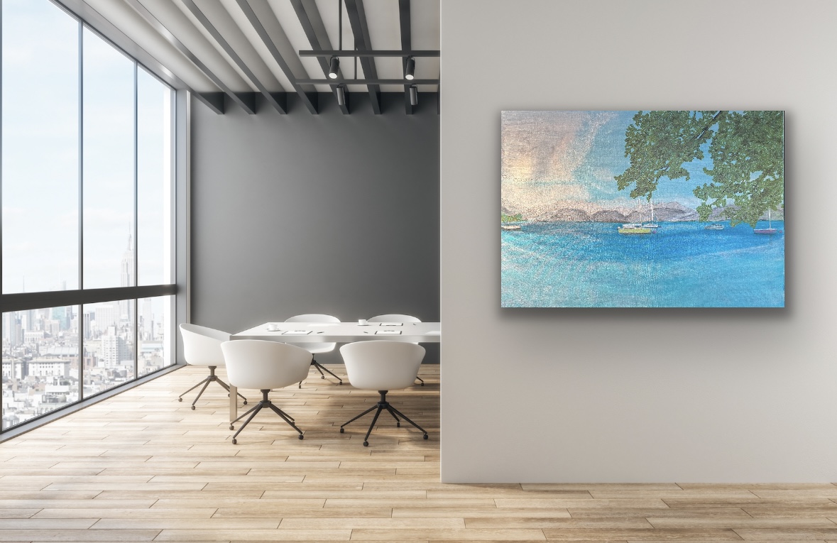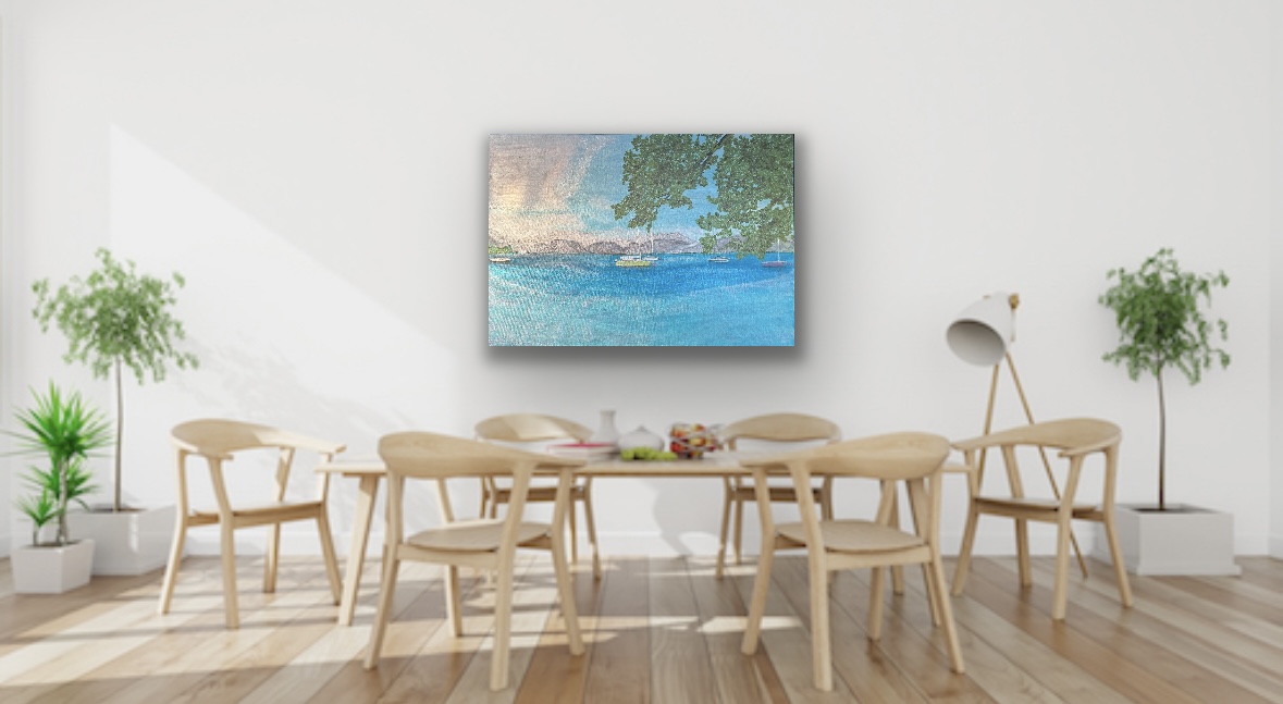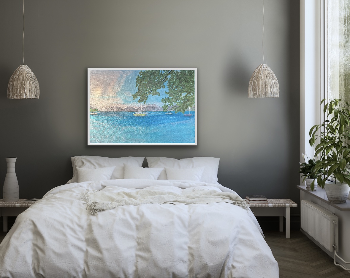 Dieses Werk eröffnet einen weiten, atmosphärischen Blick über eine glasklare Bucht, in der Segelboote sanft auf dem Wasser ruhen. Die Künstlerin erzeugt ein harmonisches Zusammenspiel aus Licht, Farbe und Tiefe.